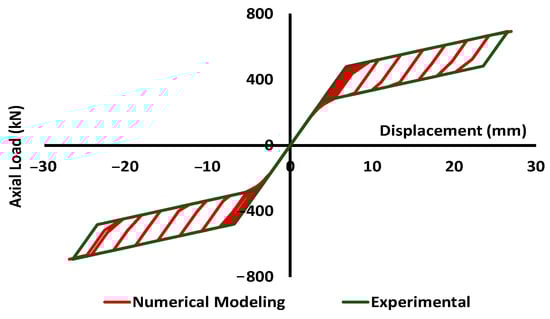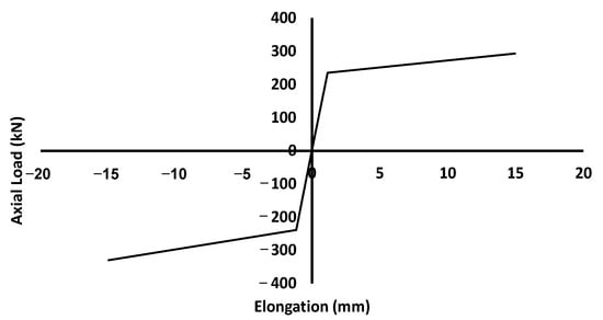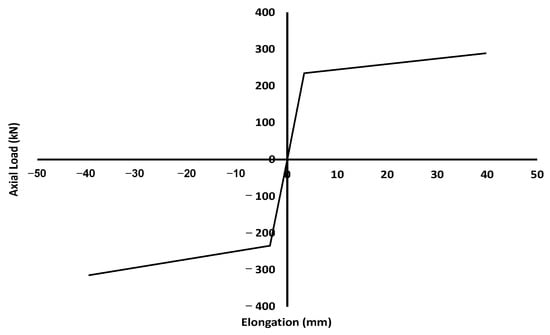 Modeling the bent was undertaken in the present study using the versatile fiber-based analysis platform SeismoStruct, as shown in Figure 3. This analysis platform can predict the structural behavior under static or dynamic loadings, considering geometric nonlinearities, and material inelasticity []. Several recent studies have verified the fiber-based modeling approach adopted by this analysis platform [,]. Each structural member was modeled using several inelastic displacement-based frame elements to increase the analysis accuracy. The unconfined and confined concrete and rebars of different cross-sections were idealized through the fiber modeling approach. The actual material properties were used for modeling the selected benchmark bridge. Concrete cross-sections were modeled using an average concrete compressive strength of 24.4 MPa through a uniaxial constant confinement concrete model. The steel yield strength of longitudinal and transverse reinforcement was 462 and 264 MPa, respectively. Reinforcing steel was modeled using the bilinear stress–strain steel model. This steel model includes kinematic strain hardening and has easily identifiable calibrating parameters []. The BRBs used to retrofit the test specimens consisted of a steel core and a surrounding mortar. These BRBs were modeled in the present study using trilinear asymmetric link elements. The axial load-elongation relationships of BRB1 and BRB2 are depicted in Figure 4 and Figure 5, respectively.