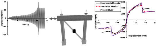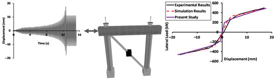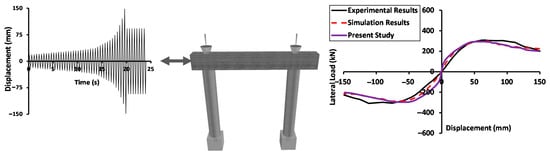 In addition to the verifications previously made in other studies for the modeling approaches of the RC structures through shake table experiments [,], the idealization adopted in the current probabilistic assessment study for existing and retrofitted bridge bents was verified before implementing it at the bridge level. The verification process ensured that the utilized modeling approach realistically predicted the seismic performance of the existing and retrofitted bridge. A bridge substructure system was chosen for this verification to represent the existing RC multi-column bridge bents []. The multi-column bridge bent was tested using quasi-static cyclic loading by Bazaez and Dusicka []. The bent has three main elements: two columns and a cap beam. The tested pier has a height of 2845 mm, and the cap beam length is 3048 mm. Three specimens were tested under cyclic testing: (i) as-built bent, (ii) retrofitted specimen with BRB1 (sacrificial), and (iii) retrofitted specimen with BRB2 (non-sacrificial), which has a smaller cross-section than BRB1. A load cell was placed at the midspan of the cap beam to monitor the internal forces and enable calculating the axial force in the BRB during testing. A load of 364 kN was applied towards gravity on top of the columns. The column footing joint had dowels with a length of 635 mm that were considered in the numerical model developed for the bridge bent.