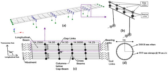 An out-of-phase motion may occur for different segments of the benchmark bridge. To ensure that pounding or unseating at bridge gaps is effectively captured under the effects of different seismic scenarios, a 3DFB model of the whole multi-segment benchmark bridge was developed to account for the interactions between different parts. The modeling approach verified in this study for the bridge substructure and its retrofit options was adopted to idealize the benchmark bridge. Different structural members of the superstructure, including the main girders, cross-beams, and gaps, were considered in the 3D model to predict the benchmark bridge’s seismic response from various analyses, as shown in Figure 9. The numerical capabilities of the analysis platform used in this study are effective enough to consider the deck as an inelastic frame element by idealizing the deck girders and cross-beams using several inelastic displacement-based elements. This would improve the seismic response prediction of the bridge.