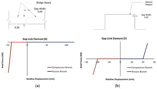 The properties and force–displacement relationships of the bridge gaps in the longitudinal and transverse directions are depicted in Figure 10. The longitudinal direction features a gap of 40 mm between bridge deck segments. In the transverse direction, the bridge has a stopper with a small gap of 20 cm in the positive (tension) and negative (compression) directions. Link elements were employed to account for the collision and slippage at the expansion joints and stoppers in the longitudinal and transverse directions, respectively. It is noteworthy that Mwafy et al. [] investigated different modeling approaches for the stiffness at the expansion joints of a complex bridge. In a detailed modeling approach [], the pounding was represented by a nonlinear spring (Hertz model) and the impact stiffness increased gradually with the penetration of pounding. The bridge seismic response using this detailed idealization was compared with a simplified linear spring model employing a maximum impact stiffness. It was concluded that the detailed gap model had a marginal effect on the bridge response. Therefore, the present study adopted the simplified approach to model the impact stiffness, as shown in Figure 10. In this modeling approach of the expansion joint and stopper, a positive relative displacement corresponds to an opening of the joint gap and a negative displacement corresponds to a closing of the gap. When the gap at the expansion joint or the stopper undergoes a relative movement in the negative direction (joint close) exceeding the gap width, the joint element begins resisting further opening (collisions). It is also noteworthy that other modeling approaches can be adopted, as recommended in previous studies []. The bridge bearings have lengths of 40 cm in the longitudinal direction and 25 cm in the transverse direction. The force–displacement relationships of the bearings were calculated considering a maximum deformation equal to half the bearing dimension in the longitudinal and transverse directions. The stiffness of the bridge bearings up to the maximum deformation was calculated based on the rubber shear modulus and bearing dimensions, as recommended in previous experimental studies [,].