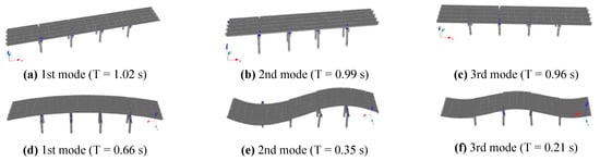 Modes of vibration of the bridge: (a–c) longitudinal direction and (d–f) transverse direction.
