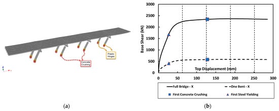 The damage locations in the longitudinal direction of the benchmark bridge are shown in Figure 12a, and the lateral capacity is depicted in Figure 12b. It is seen that the full-bridge lateral strength is almost four times the strength of one bent. The damage observed in the full-bridge model indicates yielding at a top bent displacement of 27 mm with a base shear of 1680 kN. Afterward, crushing in concrete occurs at the base of the bridge bents with a displacement of 128 mm at a base shear of 2342 kN.