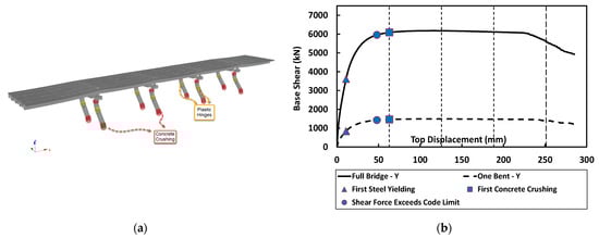 Pushover analysis results in the transverse (Y) direction: (a) deformed shape and damage locations, and (b) capacity curves of the one bent and the whole bridge.
