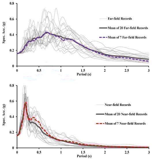 Acceleration response spectra of the selected far-field earthquake record (top) and near-source ground motions (bottom) scaled to the design earthquake intensity.