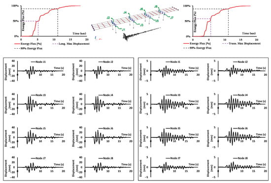 Samples of time-history analysis results are shown in Figure 15 for the seismic energy transmitted per unit time (energy flux) and top displacement histories at selected points (J1 to J8) under the far-field earthquake Bucharest when applied to the bridge in the longitudinal and transverse directions. As previously emphasized from the free vibration analysis, Figure 15 shows that the period of vibrations in the longitudinal direction is longer than the transverse counterpart. It is seen that higher top displacements are detected at the top of the intermediate bents (i.e., J3–J6). The maximum top displacement in the longitudinal direction is observed at Point J3, which results in a top drift of 0.56%, considering a pier height of 5730 mm. This corresponds to a total seismic energy of 49%. Point J6 exhibits the highest top displacement in the transverse direction, resulting in a top drift of 0.085%, corresponding to a total seismic energy of 58%. It is shown that the amount of seismic energy needed to reach this minor drift in the transverse direction is higher than that observed in the longitudinal direction of the bridge. The results confirm the significant difference between the seismic response of the bridge in the two orthogonal directions. The longitudinal direction exhibits higher deformations than its transverse counterpart, as shown in the higher top drift observed in the former direction at lower seismic energy.