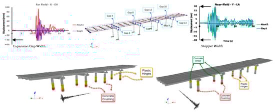 Samples of the deformation demands at the expansion joints and damage locations of the investigated bridge in the longitudinal direction under a far-field earthquake, represented by Loma Prieta, Emeryville, and the transverse direction when subjected to the near-field input ground motion Lazio Abr.-Cassino-Sant Elia are shown in Figure 16. Multiple pounding instances between bridge segments were observed in the longitudinal direction of the bridge when the expansion joints closed and reached their maximum widths of 40 mm (negative displacement), as depicted in Figure 10. However, unseating was not observed as the maximum positive displacement (gap opening) did not reach the threshold of 280 mm. In the transverse direction, the superstructure movement was controlled by a stopper with 20 mm gaps in both directions (i.e., compression and tension deformations, refer to Figure 10). The pounding was observed once the gaps reached a displacement of ±20 mm.