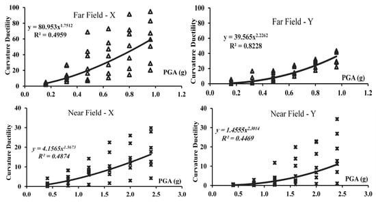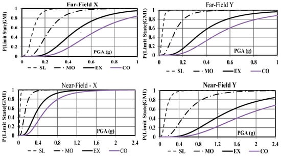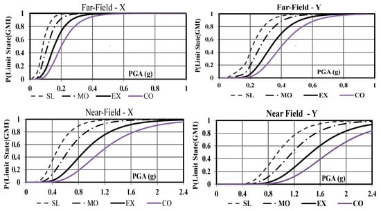 In order to account for input ground motion uncertainty, fourteen earthquake ground motions were selected in the present study to represent two critical seismic scenarios in the study region, as previously discussed. The derivation of vulnerability relationships was undertaken using IDAs by subjecting the benchmark bridge to the selected input ground motions in the longitudinal and transverse directions. Each input ground motion was scaled to different intensity levels. PGA-scaling factors of 0.16 and 0.40 g were applied for far-field and near-field input ground motions, respectively. With the design earthquake considered as 0.16 g, the IDA started with 0.16 g (1.0× Design) and ended with 0.96 g (6.0× Design) for far-field earthquakes, while for the near-field earthquake, the analysis began with 0.40 g (2.5× Design) and ended with 2.40 g (15.0× Design). This scaling approach ensured that all performance limit states adopted in this study were satisfied, as discussed hereafter. The fragility relationship is a function of the bridge capacity against a predefined performance limit state, considering the uncertainty in capacity. This fragility curve would be a step function for a deterministic assessment scenario if uncertainties are neglected. The fragility functions are generated using the following expression []: , where is the probability of exceeding a predefined performance limit state (PLSi) given the intensity measure (IM) value, Φ is the standard normal cumulative distribution function, = ln (median of the damage measure ‘DM’ capacity for PLSi), = ln (calculated median demand, given the IM value from the regression analysis best-fit power law), and are demand, capacity, and modeling uncertainties, respectively. The is directly calculated when IDA is used to develop fragility curves using the standard error of the demand data. The capacity uncertainty due to material properties and other sources and modeling uncertainty parameters are 0.3 and 0.2, respectively [].