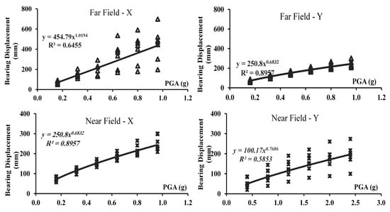 IDA results of bridge bents bearing displacement (BD) demands using far-field (top) and near-source (bottom) input ground motions in the longitudinal (left) and transverse (right) directions of the benchmark bridge along with the power law equations.