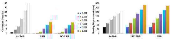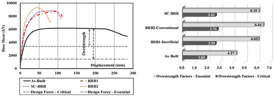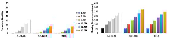 The overstrength factors associated with the as-built bridge and each retrofit technique are presented in Figure 22. The overstrength factors are presented based on the calculated seismic design forces in the case study area for two cases; namely, the bridge is considered an essential or critical structure []. It is noteworthy that the overstrength factors reported in the literature for as-built and retrofitted bridges are limited [,,]. Ghee et al. [] tested a set of 25 RC circular columns for bridge columns and assessed different parameters, such as the flexural ductility and axial load on the overstrength factor. The study indicated that the overstrength factors of bridge columns were in the range of 1.0 to 2.3. Kappos, Paraskeva, and Moschonas [] studied seven bridges in a high seismicity region in Europe. It was found that these bridges had overstrength factors in the longitudinal direction in the range of 1.3 to 3.4. In the transverse direction, these bridges had overstrength factors of 1.2 to 5.8. It is shown in Figure 22 that the overstrength factors of the as-built benchmark bridge improved after retrofitting with different types of BRBs and were comparable to those reported in previous studies for entire bridges. Moreover, it is shown in Figure 22 that retrofitting the benchmark bridge using BRBs reduced the displacement ductility. However, it should be noted that the main objectives of these braces are to act as structural fuses, sustain high seismic demands, and dissipate seismic energy while keeping the structure almost within the elastic range. Controlling the damage in the benchmark bridge through this retrofit approach enables the rapid replacement of the sacrificial BRB elements [].