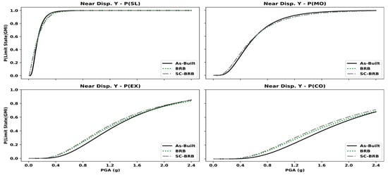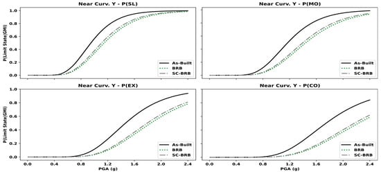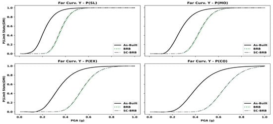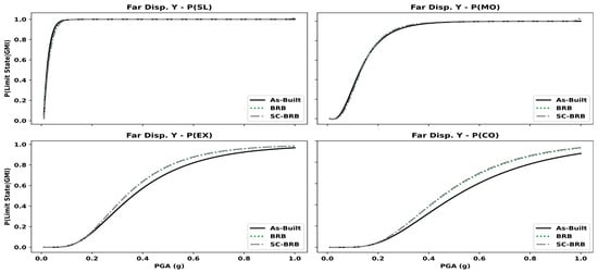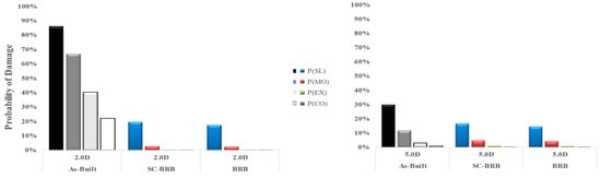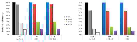 As previously emphasized, this probabilistic assessment study focused on the seismic performance assessment of the retrofitted benchmark bridge in the transverse direction using different BRB systems to arrive at the best retrofit option. The alternatives considered were: (i) BRB (previously referred to as BRB1) and (ii) SC-BRB. Several time history analyses were performed to assess the seismic performances of the existing bridge and its retrofitted alternatives. Under the effects of the two considered seismic scenarios, it is seen that the BRB techniques are effective at reducing CD demands when compared with the as-built structure, as shown in Figure 23 and Figure 24. However, these retrofit alternatives increase BDs, mainly at high design intensities. These initial observations are discussed in more detail next.