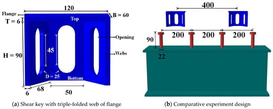 Design concept: the web adopts the form of three folded plates, using the deformation characteristics of the folded structure to improve the ductility of members; at the same time, the stiffness of the two main axes can be balanced to avoid the problem of strong and weak axes, which is more conducive to resisting earthquake effects in different directions. Web openings: can improve the embedded effect with concrete, and shear keys can form a bite effect with concrete to improve the cooperative work ability of the two. Flange: can enhance the stability of the web and anti-lift effect. Specific size: stud M22 × 90 mm, shear key web and flange thickness of 6 mm, web length of 68 mm, height of 90 mm, a middle of the web diameter of 25 mm, height of 70 mm long circular hole, and specific size as shown in Figure 1a. On the amount of steel, a shear key is approximately equal to two studs, and the comparative test is designed according to this, as shown in Figure 1b.