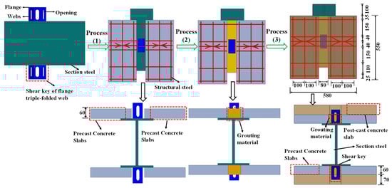 In this paper, four groups of specimens are designed. The parameters are listed in Table 1. The composition and forming process of the specimens are shown in Figure 2. The specific process is as follows: (1) welding the bottom of shear keys to the upper flange surfaces of steel beams and precast 60 mm thick reinforced concrete slab, assembled on both sides of the steel beam; (2) the joint (shear key width) is reserved to fill the joint; and (3) layout of surface steel overall pouring 70 mm concrete. The slab is 580 mm × 550 mm × 130 mm, using C30 concrete, of which 60 mm is precast slab and 70 mm post-cast. The longitudinal and transverse rebars in the plate are HRB400 rebars with a diameter of 8 mm, and the rebars in the hole are HRB400 rebars with a diameter of 12 mm, and the intermediate steel beam is H-shaped steel Q235 grade. The specification is HW300 mm × 200 mm × 8 mm × 12 mm.