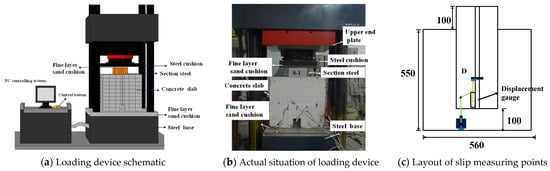The loading device uses a long column press (Figure 3), and the measuring point D (Figure 3c) is arranged on the steel beam web to measure the slip of the steel beam. The pressure is obtained by the pressure sensor of the long column press. The loading system adopts force-displacement mixed loading, and the steel beam is controlled by force before sliding. The loading rate is 0.15 kN/s, and each loading is 100 kN for two minutes. Displacement control was adopted after sliding, and the loading rate was 0.03 mm/min. When the bearing capacity decreased to 85% of the peak load, the loading was stopped.