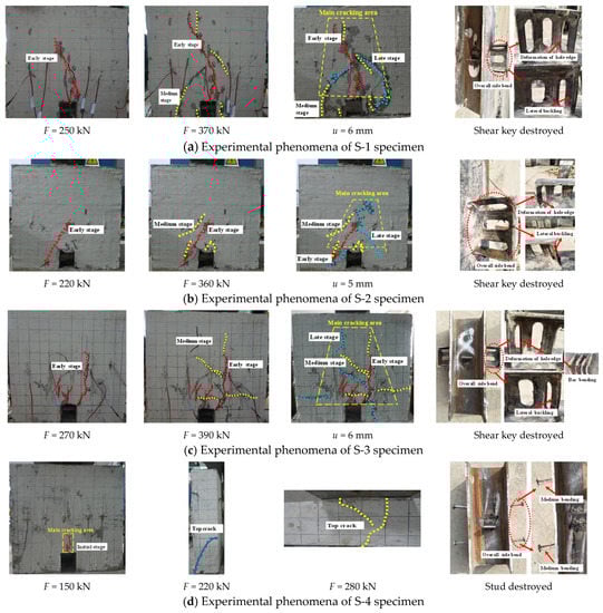The crack development process of S-1, S-2, and S-3 specimens is the same, as shown in Figure 4a–c. There is no obvious phenomenon at the beginning of loading; when the load reached 250 kN, the steel beam began to slip, and the bottom of the concrete slab first appeared with vertical cracks. As the load continues to load, cracks continue to extend upward; when the load reaches the ultimate load, 45° oblique cracks appear on both sides of the shear key, and new vertical cracks appear at the bottom of the concrete slab. The bearing capacity decreases to 85% of the ultimate bearing capacity, stopping the loading. The cracks develop around the concrete slab, and finally, the trapezoidal main cracking area is formed. Among them, the S-3 specimen is inserted with steel bars at the opening, the concrete slab is damaged more seriously, and the crack distribution is larger and more uniform. When the concrete is stripped, the failure of the shear key is shown in Figure 4a–c. The shear key bends overall along the push-out direction, and the lateral web and the opening edge show apparent buckling.