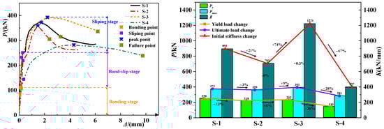 The characteristic values of load and displacement are shown in Table 4. Compared with studs, the slip load of shear keys increases by more than 45%, the ultimate bearing capacity increases by more than 32%, and the failure displacement reach 55% of studs. Compared with the S-1 and S-2 specimens, the specimens’ ultimate load with steel bars inserted at the opening increased by 6%. The bearing capacity margin was basically the same. In summary, the bearing capacity of the triple-folded shear key is significantly higher than that of the stud. It has good embedded performance and stronger integrity with the concrete slab. The effect of steel bars through the opening on the bearing capacity is small, but the stiffness degradation of the specimen is slow, and the ductility performance is good.