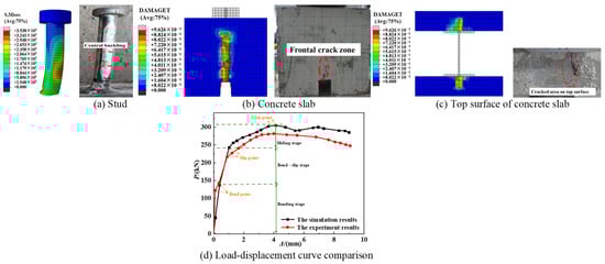 The studs’ simulation results are consistent with the experimental phenomena, shown in Figure 9. The maximum stress appears in the middle of the studs, and the lateral bending occurs along the push-out direction. The concrete slab is a dot-like constraint, and the constraint range is small. The comparison of load-displacement curves is shown in Figure 9d. Before sliding, the curves basically overlap; as the load increases and the curves enter the sliding stage. Overall, the variation trend of load-displacement curves is basically the same, and the numerical calculation bearing capacity is slightly higher, reaching 305 kN, with an error of about 8.5%.