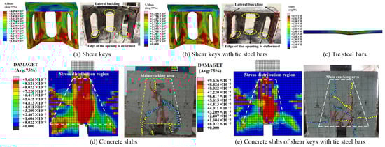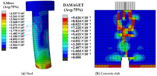 Under cyclic loading, the stress distribution of shear keys and concrete slabs is shown in Figure 16a,b. At the beginning of loading, the shear key is basically in an elastic state, the maximum stress is concentrated in the lower part of the web, and the stress distribution is relatively uniform. As the load continues, the shear key web begins to yield, and the stress distribution range becomes larger; after stopping loading, the maximum stress is distributed at the edge of the opening, and the flange is basically in an elastic state, and the web completely yield. During the whole loading process, the maximum stress first appears near the shear key and at the bottom of the slab, which is distributed in a vertical stripe shape. As the load continues, the stress distribution appears in the 45° direction and the middle of the concrete; the concrete slab is seriously damaged after stopping loading. The maximum stress distribution range accounts for more than 60% of the slab surface. Under the action of horizontal hysteretic load, first, the roots of the stud yield, and as the load increases, the failure area develops upward until the middle of the stud. The concrete slab is first damaged at the top, and with the increase of load, the failure area develops downward, forming a strip plastic zone along the vertical direction. Next, some damage is formed horizontally, and the overall plastic region accounts for about 15%, as shown in Figure 17. Overall, the damage degree of the stud is light, only the root yield. The failure area of a concrete slab under stud constraint is significantly reduced compared with the failure area of the new shear key; the constraint capacity under earthquake is significantly lower than the new shear key.