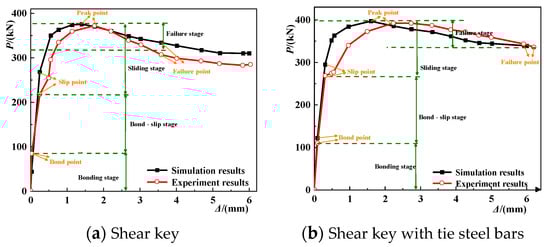 The comparison between the simulation results of the triple-folded plate shear key and the experimental phenomena is shown in Figure 10a,d, and the comparison between the load-displacement curves is shown in Figure 11a. At the beginning of loading, the curves are in good agreement. After reaching the peak load, the bearing capacity decreases, and the trend is roughly the same. The ultimate bearing capacity of numerical calculation is slightly higher than the test results, but the general agreement is good. The simulation results of the shear key with tie steel bar are compared with the experimental phenomena, as shown in Figure 10b,e, and the load-displacement curve is compared, as shown in Figure 11b. The bearing capacity and ductility of the specimen can be improved by penetrating the steel bar at the opening. Obvious deformation occurs in the middle of the tie steel bar, as shown in Figure 10c, which is basically consistent with the test results. From the analysis of bond-slip development law, the bond, bond-slip, slip, and failure stages are in good agreement. In summary, the finite element model has high accuracy and can better realize the bond-slip performance of the new shear key.