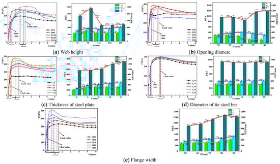 The opening diameter (D) parameters are shown in Table 5, and the comparison of load-displacement curves and parameter influence analysis are shown in Figure 12b. With the increase of opening diameter, the yield load decreases, and the stiffness decreases first and then increases; the opening diameter is 20 mm (minimum) or 40 mm (maximum), bearing capacity is low; when the hole diameter is 30 mm, the bearing capacity is the highest, reaching 389 kN. The hole diameter is 25 mm, 35mm; the curve drops gently, and the ductility is good; the remaining model’s curve reaches the peak load, the bearing capacity drops sharply, and the ductility is poor. In summary, when the opening diameter is too small, the shear key strength does not match the concrete strength, which affects the embedded effect between the shear key and the concrete and leads to the crushing failure of the concrete. However, when the opening diameter is too large, and the stiffness of the steel plate is weakened too much, the mechanical performance of the shear key will be reduced. Therefore, when the opening diameter is 25 mm–30 mm, the embedded effect of the shear key is the best, and the ability to work with the concrete is stronger.