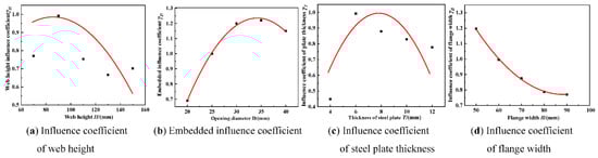 The influence coefficient of flange width γB is defined as the ratio of to . Then, the calculated values are fitted, as shown in Figure 14d. The formula for calculating the influence coefficient of flange width is as follows: