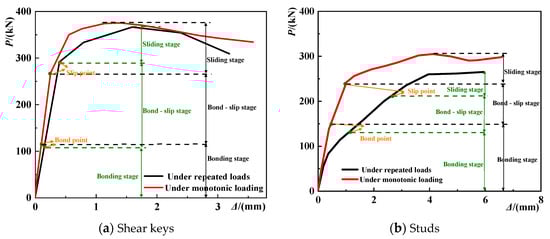 The skeleton curves of shear keys and studs are shown in Figure 19. The yield point Py and the peak point Pmax (the yield displacement Δy is calculated by the equivalent elastic-plastic yield method, and the displacement Δmax of the peak load is taken as the failure displacement Δu) are shown in the figure. Overall, the shear key skeleton curve experienced three stages: bond, slip, and failure. The skeleton curve of studs only experienced two stages of bond and slip. Compared with studs, the shear key had larger initial stiffness and higher bearing capacity under repeated load, but its deformation was relatively poor.