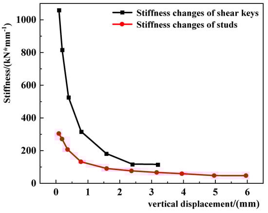 In this paper, the displacement ductility coefficient is used to measure the deformation capacity of the specimen. The calculated values of the displacement ductility coefficient of the shear key and the stud are shown in Table 7. Under repeated load, the ductility coefficient of the shear key is 3.3, and the ductility coefficient of the stud is 5.4. The ductility coefficient of the stud is about 1.6 times that of the shear key, and the deformation capacity is strong. However, the ductility coefficient of the shear key is greater than 3, and it also shows good deformation ability.