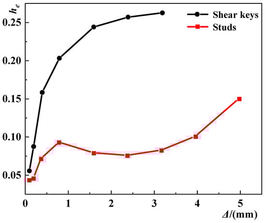 The comparison of the secant stiffness K of each model is shown in Figure 20. Under the action of horizontal push-out, the initial stiffness of the triple-folded web shear key is much larger than that of the stud, by about four times. Large initial stiffness can better control deformation; subsequently, the stiffness is degraded and gradually reduced to 0. In the whole process, the internal force can be well adjusted. Overall, the stiffness of the new shear key changes greatly, which is very beneficial to controlling slip deformation and internal force transfer. The equivalent viscous damping coefficient he measures the energy dissipation capacity of the model. The change of the equivalent viscous damping coefficient of the shear key and the stud is shown in Figure 21. Overall, the damping coefficient of the shear key and the stud increases with the displacement. The maximum damping coefficient of the shear key is 0.26, and the stud is 0.16. Compared with the stud, the damping coefficient of the shear key is increased by 1.6 times. The seismic energy dissipation capacity is strong, and the advantage is obvious.