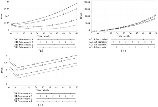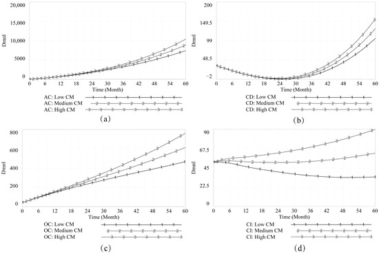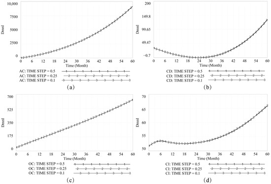 Defining an appropriate time scale is necessary for system examination. To-collude decision making is bidders’ behaviors, but the extent to which bidders’ behaviors represent company behavior is definitely high. According to the Enterprise Life Cycle theory (ELC), a company’s life cycle consists of four small stages (e.g., start-up, growth, maturity, and death); each is around 3–6 years. Hence, to better observe the system’s recurrent fluctuation, we assigned a time scale of sixty months to reflect the evolution of to-collude decision making. The initial time step was set as . After that, three scenarios were determined using different time steps: , and . As Figure 3 tells, the evolution of AC, CD, OC, and CI has minor differences between scenarios, suggesting that the model’s integral error is small and acceptable.
