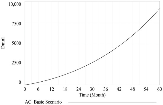 Five scenarios were included to explore the impacts of factors on to-collude decision making. Specifically, Scenario 1 functions as the basic scenario to illustrate the impacts without changing the external environment, that is, inputting the initial data collected to observe the system’s future evolution based on existing conditions and with no control group. In addition, four extra scenarios were set by adjusting the following factors: collusion motivation, enterprise performance, enterprise network relationship, and government regulation intensity. The basic scenario (Figure 4) describes the influence of cognitive biases on conspirators’ to-collude decision making. The evolution of to-collude decision making was analyzed with initial values of variables and parameters under invariant existing external environment (i.e., basic scenario). As Figure 4 indicates, the AC grows following an exponent curve, suggesting a stimulus enhancement effect in collusive bidding. Nevertheless, collusion is rampant, provided an explicit prohibition of laws and regulations. Thus, the results of basic-scenario simulation reflect a character of nonlinearity development of the CDAS.
