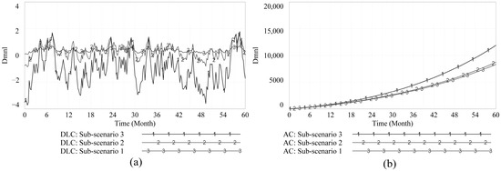 Evolution of DLC and AC under the enterprise performance scenarios. Subfigures (a,b) illustrate the DLC and AC curves under varied sub-scenarios.