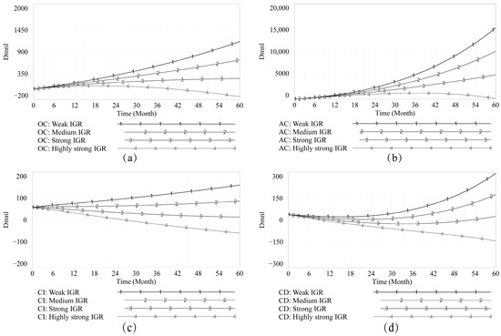 Evolution of cognitive biases and AC under the IGR change scenario. Subfigures (a–d) illustrate the OC, AC, CI, and CD curves under varied IGRs.