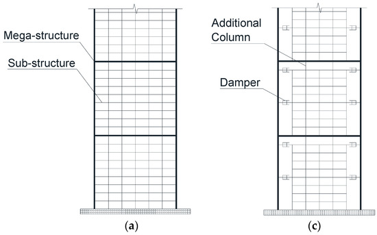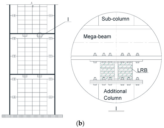The mega-sub controlled structure system (MSCSS) with LRBs, as shown in Figure 1b, is a new vibration-controlled system. It combines the MSS configuration, LRBs, and the idea of the TMD. It can achieve better seismic performance than the MSS and the traditional MSCSS without LRBs (Figure 1c) [3,4]. In the MSCSS, the sub-structures in the MSS are used as tuning masses. Constraints between the mega-structure and sub-structures in the MSS are replaced by viscous dampers. The relative motion between the main structure and the sub-structure can dissipate the energy input by the earthquake, thereby controlling the seismic response of the structure. Since the mass ratio of the sub-structure to the main structure can reach 100%, MSCSS performs better than TMD in strong earthquakes [5,6,7]. Additional columns on sub-structures in the MSCSS can support mega-beams above, reduce bending moments in mega-beams, and allow for larger beam spans. LRBs on additional columns not only dissipate the energy but also further increase the relative motion between the mega-structure and sub-structures, thereby increasing the energy dissipated by the dampers [8,9,10].