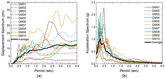 Figure 2. Response spectrum of the selected input ground motions. (a) Displacement response spectrum; (b) acceleration response spectrum.