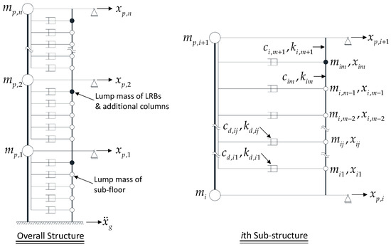 The MSCSS with LRBs can be simplified to a lumped mass model as shown in Figure 4. The mass of the mega-structure on each mega-floor is assumed to be concentrated at the roof of the mega-floor, and it is denoted as m p , i , where the subscript i is the mega-floor number from 1 to n. The displacement of m p , i relative to the ground is x p , i . Similarly, the mass of each sub-floor is assumed to be concentrated at the roof of the sub-floor, and it is denoted as m i j , where j is the sub-floor number from 1 to m. The floors where LRBs and additional columns are located are also counted as sub-floors, which are colored in black in Figure 4 to distinguish them from other sub-floors. The displacement of the lumped mass of each sub-floor is denoted as x i j . The damping coefficient and stiffness of each sub-floor frame are denoted as c i j and k i j , and the damping coefficient and stiffness of the dampers or LRBs are denoted as c d , i j and k d , i j .