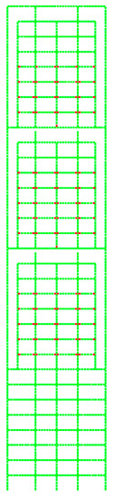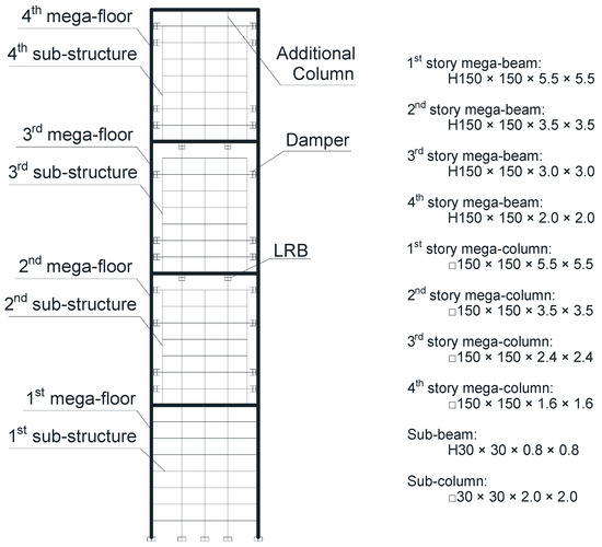 The finite element model uses Model III and its optimization results are presented by Fan et al. in [4]. The layout of the structure and section properties are shown in Figure 5. The mega-structure has four mega-floors and is represented by bold lines. Four sub-structures are represented by thin lines, and each has seven sub-floors. The first sub-structure is connected with the mega-structure, while the others are partially released and connected to the mega-structure through viscous dampers, additional columns, and LRBs. The damper and LRB are modeled with the Maxwell viscoelastic model and the Bouc–Wen model, respectively. The damping coefficient and the damping exponent of the damper are 4.5 kN·s/m and 1.4. LRB400 is used. The axial stiffness is 1700 kN/m. Shear stiffnesses before and after yield are 24 kN/m and 2.4 kN/m. The model is 128 m tall and 26 m wide. The heights of the mega-floor and sub-floor are 32 m and 4 m, respectively. The gap between the mega-structure and the released sub-structure is 2.7 m. The sides and the middle beams of the released sub-structures are 4.7 m and 5.6 m. The steel of the frame is Q345 according to Chinese standards.