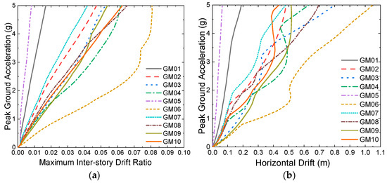 The IDA curve for the entire structural system and the LRBs are shown in Figure 6a,b. The curves generated under different ground motions are dispersed. The slopes of the curves vary widely, and they exhibit a strong correlation with the displacement response spectra shown in Figure 2a. For instance, at 4 s, which is the natural period of the analyzed model, the displacement response spectrum of GM06 is the highest and that of GM05 is the lowest. These correspond to the curve slopes in Figure 6: GM06 has the smallest slope and GM05 has the largest.