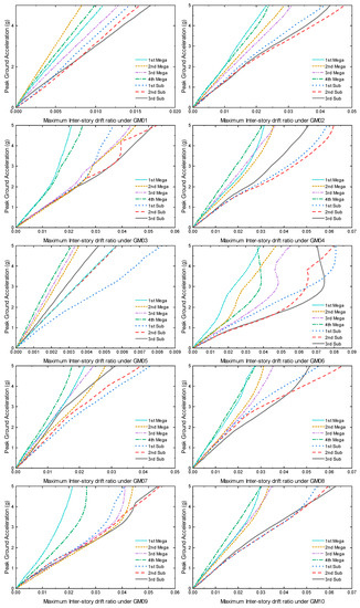 Figure 7 shows the IDA curves of different parts of the structure. These parts include the four mega-floors and three released sub-structures. The IDA curves intersect each other, indicating that the most deformed location changes with earthquake intensity. The location also varies under different ground motions and is related to the mode of the structure. However, the maximum θ almost always occurs on sub-structures rather than the mega-structure. This is desirable because the mega-structure is the more critical part. Sub-structures are attached to the mega-beams in the mega-structure. The different sub-structures are independent of each other, and the weight of each sub-structure is borne by the mega-structure. The failure of one sub-structure will not cause the rest of the structure to fail, but the collapse of the mega-structure will bring down the entire structure. So, the mega-structure should be stronger than the sub-structures.