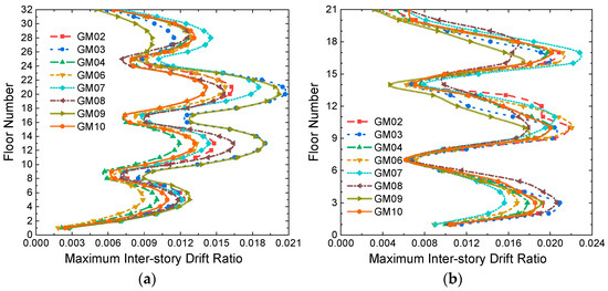 The deformation of the structure is measured by the inter-story drift ratio. According to the China seismic design code GB50011-2010, when θ > 1 / 50 , high-rise buildings are considered to fail [34].