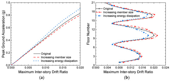 The IDA curves for the original structure and the two modified structures are shown in Figure 10a. The maximum inter-story drift ratios of the three structures are shown in Figure 10b. The PGA, drift ratio, and LRB deformation at failure are reported in numbers in Table 4. It can be seen that strengthening the weak member does not work and should not be used. Increasing the energy dissipation produces the desired result. The failure PGA in the second approach is increased and the maximum inter-story drift ratio is decreased compared to the original structure.