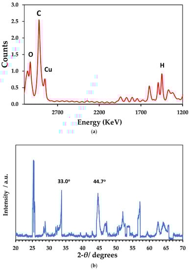 Complete Energy-dispersive X-ray (EDX) and X-ray diffraction (XRD) analyses were performed on graphene oxide. The EDX of graphene oxide is presented in Figure 2a, and the ratios of elemental atoms such as oxygen (O) and carbon (C) were 24.3% and 75.7%, respectively. It should be noted that the graphene oxide sample was placed on a sheet of copper during the testing process. For this reason, copper (Cu) signals might be noticed in the EDX results. The X-ray diffraction (XRD) spectra of graphene oxide are displayed in Figure 2b. The presence of diffraction peaks at 2θ = 33.7° and 2θ = 44.7° demonstrates an interlayer spacing of 0.783 nm, which is allocated to the (001) diffraction peak of graphene oxide. Similar results have been reported by past studies [,].