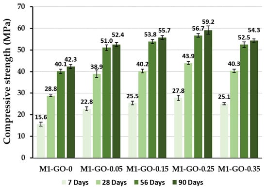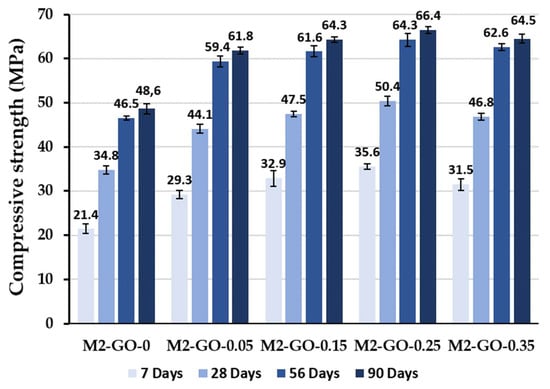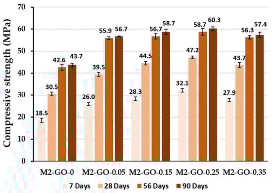 Moreover, at a 0.35 wt.% addition of graphene oxide, it was observed a reduction in compressive strength compared to the 0.25 wt.% graphene oxide-based GPC samples. The decrease in sample compressive strength can be related to the agglomeration of graphene oxide nanosheets in the geopolymer concrete because of the hydrophilic nature and high surface area. However, the strength in the early age of graphene oxide-modified GPC (M3-GO-0.25) was 35.58 MPa at 7 days and 51.39 MPa at 28 days, which is 70 and 91% higher than that of the reference sample (M3-GO-0). GPC mix proportion discussed here mainly stands on fly ash, which typically shows lower compressive strength when cured at room temperature []. From the laboratory results, graphene oxide was recognized to have a vital role in enhancing strength of FA-dominated GPC because of the dense matrix generated and high specific area of graphene oxide nanosheets [].