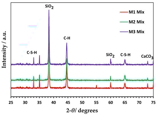 X-ray diffraction analysis was performed on representative samples of M1 mix, M2 mix, and M3 mix with 0.25% GO at 90 days (Figure 7). Calcium silicate hydrate gel growth was noticed because of the nucleation of (C-S-H) by GO flakes []. The hydration process was accelerated when GO reacted with calcium hydroxide, developing calcium silicate hydrate gel; the developed C-S-H was noticed to be amorphous. Graphene oxide enhanced the mechanical strength, demonstrating a dense microstructure of the sample with low crystals of Ca (OH)2 []. Figure 7 showed that the M3 mix has more intense silica, calcium silicate hydrate peaks, and calcium hydrate than other mixes. GO is a suitable strengthening material for the sample. The high content of quartz (SiO2) of fly ash and the dense structure of the sample is the significant reason behind the improved performance of geopolymer GO concrete.