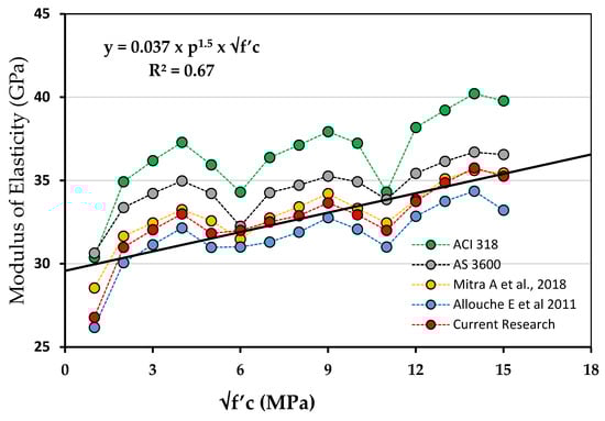 (3) Mitra A et al., 2018 [] proposed Equation (4) to evaluate the modulus of elasticity of graphene oxide-modified geopolymer concrete.