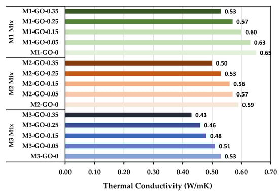 - The thermal conductivity of GPC GO modified samples depicted that the M3 mix had the lowest thermal conductivity (about 33%) lower than other mixes.
