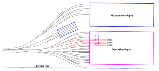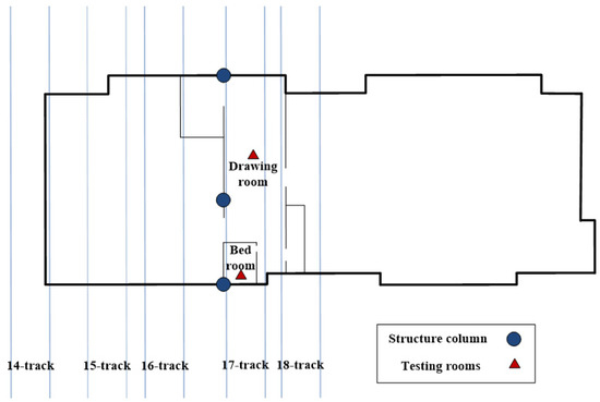 To consider the vibration comfort in the rooms with different usage functions, field experiments were conducted to measure the amplitude in the drawing room and bedroom of each test floor, as shown in Figure 4. When a train passes, the vertical vibrations in a building are significantly greater than the horizontal vibrations [11]. Considering that the impact of vibration intensity and human comfort are directly negatively correlated, the vibration measurement and analysis considered only the vertical vibrations in this study. The test conditions were divided into two groups of working conditions: normal operation and scheduled shunting. The normal operation conditions included four peak-hour periods: 10:30–11:30 p.m.; 11:30–12:30 p.m.; 4:30–5:30 a.m.; and 5:30–6:30 a.m. Scheduled shunting was performed during the daytime to allow trains to pass through the test tracks as scheduled. Figure 5 shows the operational depot used in the field test.