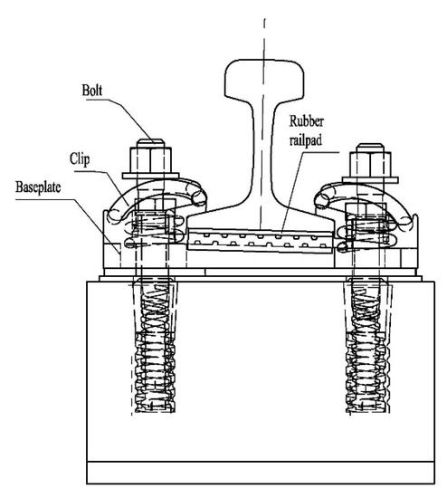 The plan view of the metro depot is shown in Figure 1. The north side of the metro depot is the maintenance depot, responsible for the daily maintenance of trains. On the south side of the metro depot is the testing line for the high-speed testing and performance evaluation of trains to ensure safe operation. The throat area is located on the west side of the operation depot, connecting the train entry and exit lines. The over-track building under the test is located above the operating depot, and the test tracks are 14–18. Table 3 shows the train and track parameters in the operating metro depot. We measured the combined stiffness of the type I separate fastener system (see Figure 2). The average measurement results show that the combined static stiffness of the fastener is 40.35 KN/mm, and the calculated combined dynamic stiffness is 38.9~43.7 KN/mm.