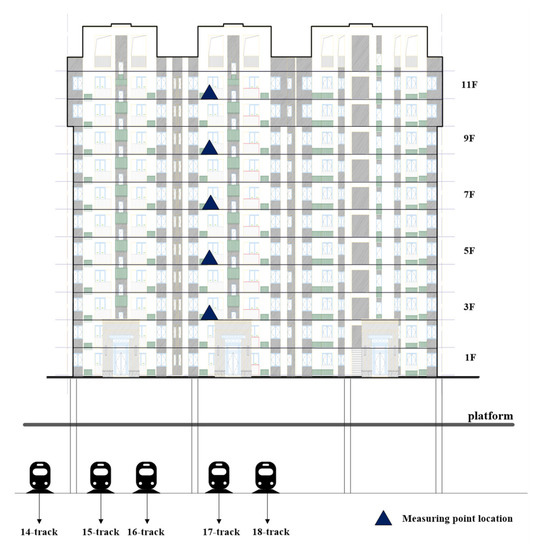 Since the speed of the train is the highest at the entrance/exit, the train will generate more vibrations in the building near the entrance/exit when the train is running, which will bring higher annoyance to the occupants. Therefore, the 11-story building in Figure 1 was selected as the test. Figure 3 shows the sectional view of the over-track building under the test, which has 11 floors; the test floors included the third, fifth, seventh, ninth, and 11th floors. The test floors are all affected by the vibrations of trains on tracks 14–18 under the platform.