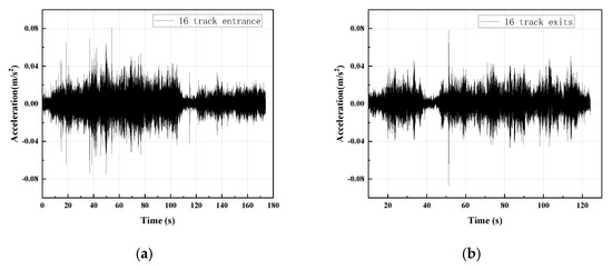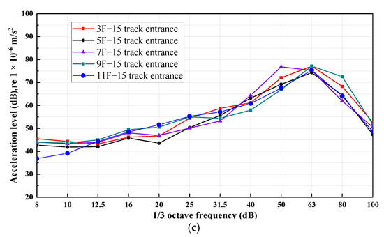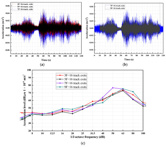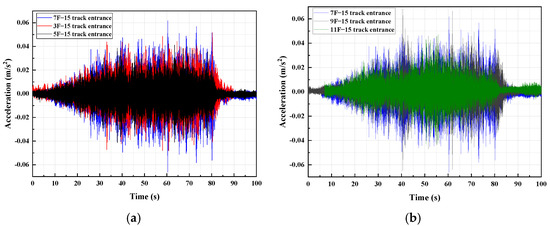 The analysis was conducted for the entrance of track 15 and the exit of track 16 to determine the vibration responses at the entrance and exit of the operation depot on different floors. The acceleration was analyzed in the time and frequency domains in the bedroom on each of the test floors, to illustrate the transmission pattern of vibrations between floors.