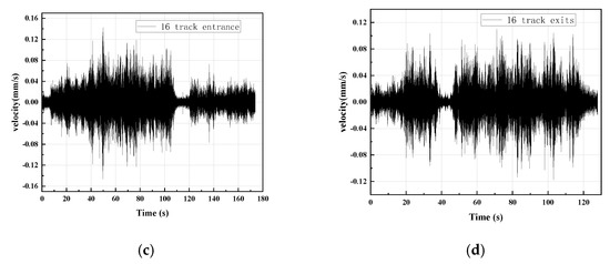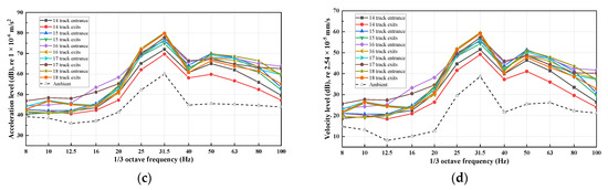 (a) Vibration acceleration response of the third-floor drawing room at the entry of track 16; (b) vibration acceleration response of the third-floor drawing room at the exits of track 16; (c) vibration velocity response of the third-floor drawing room at the entry of track 16; (d) vibration velocity response of the third-floor drawing room at the exits of track 16.