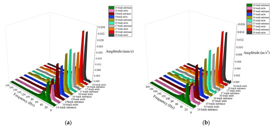 The results show that for the different tracks, the vibrations transmitted to the building showed a peak of 30 Hz at both acceleration and velocity, with the main frequencies mostly between 20 Hz and 60 Hz. In the one-third octave spectrum, the velocity and acceleration followed the same trend in frequency, having a peak at 31.5 Hz. The peak frequency was related to the resonance of the vibration amplification in the corresponding frequency band with the vertical vibrations in a specific room. The ambient vibrations had a lower acceleration and velocity than the over-travel vibrations in the frequency domain, but the peak frequency was the same as that of the over-travel vibrations. When the train passed over different tracks, the vibrations in the building showed the trend that the vibrations of the vertically downward track of the tested room was larger than the non-vertically downward track vibrations, that is, the vibrations on tracks 14 and 15 were smaller than the vibrations on tracks 16–18.